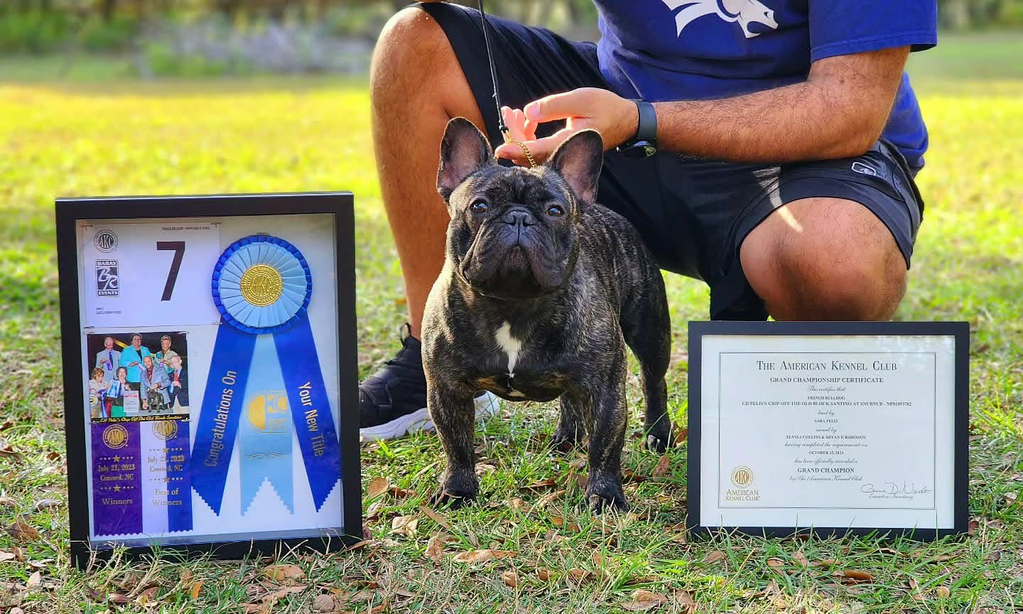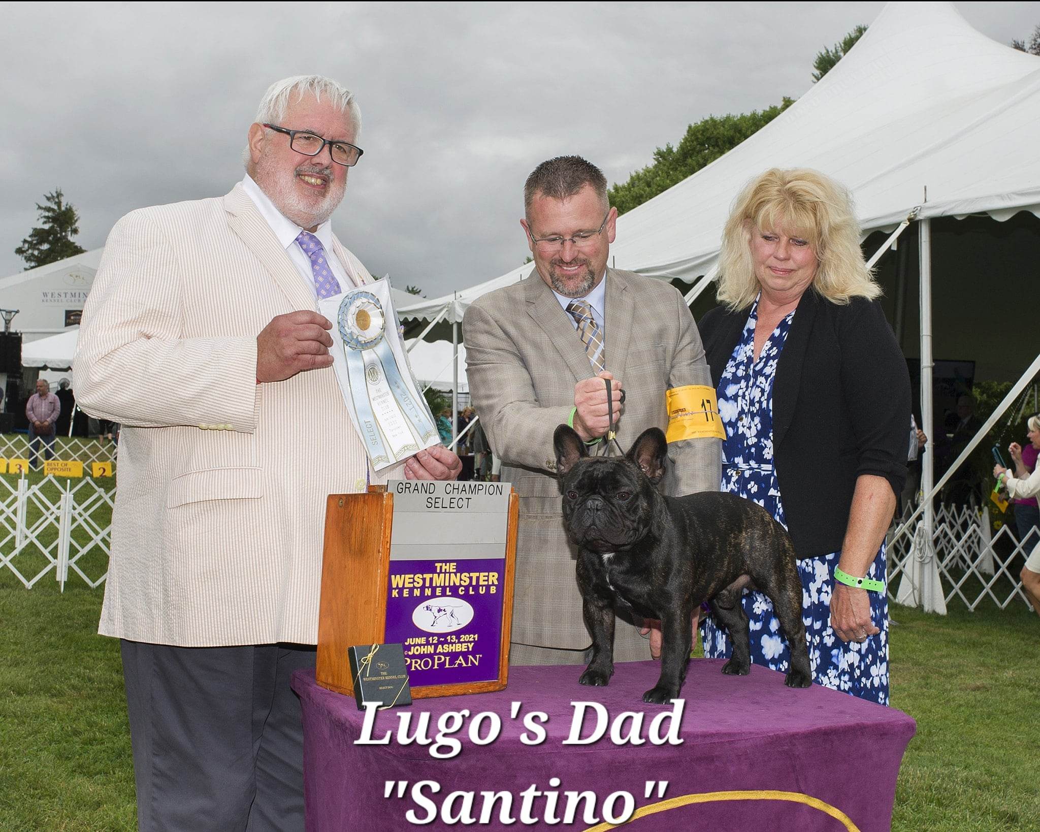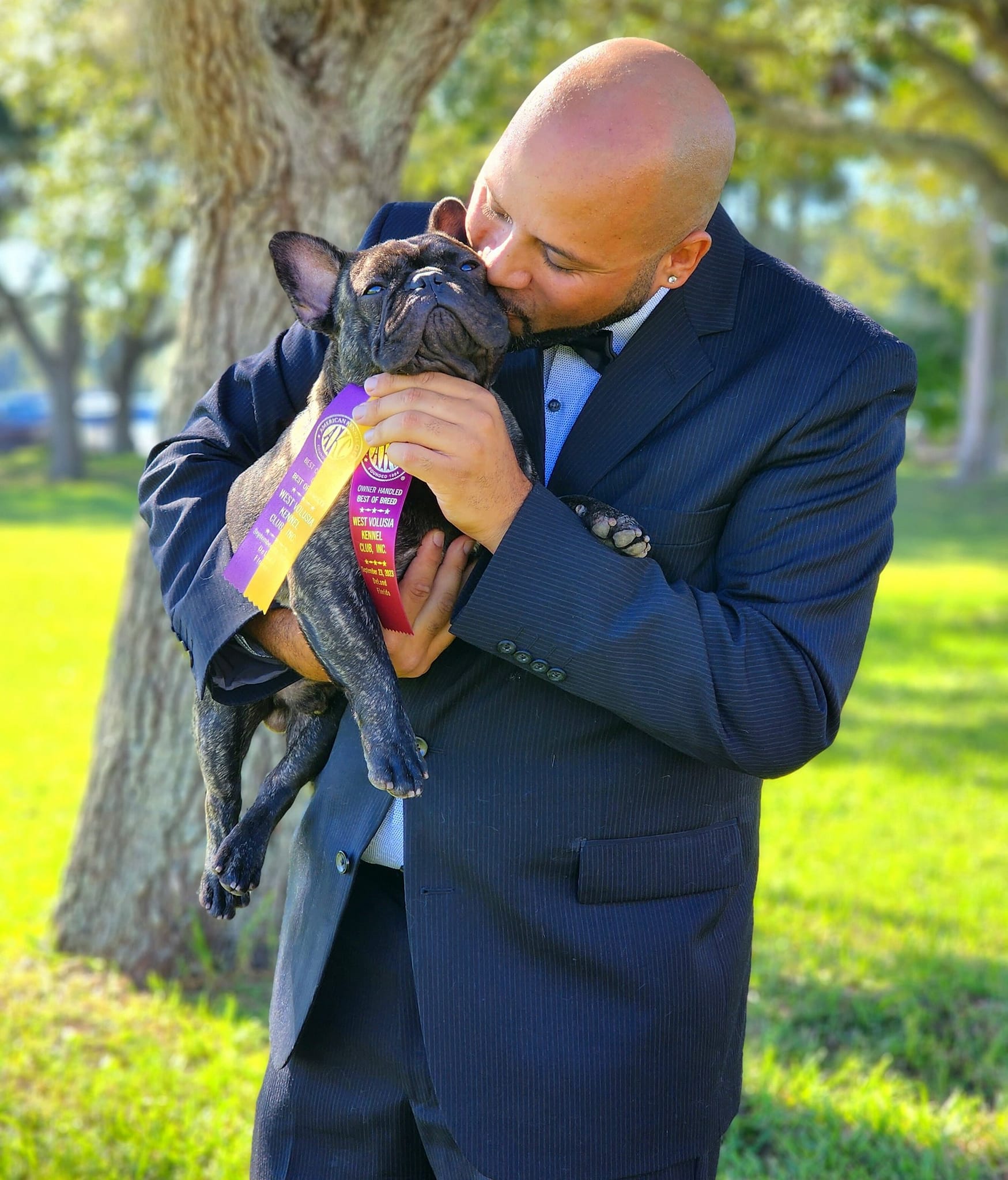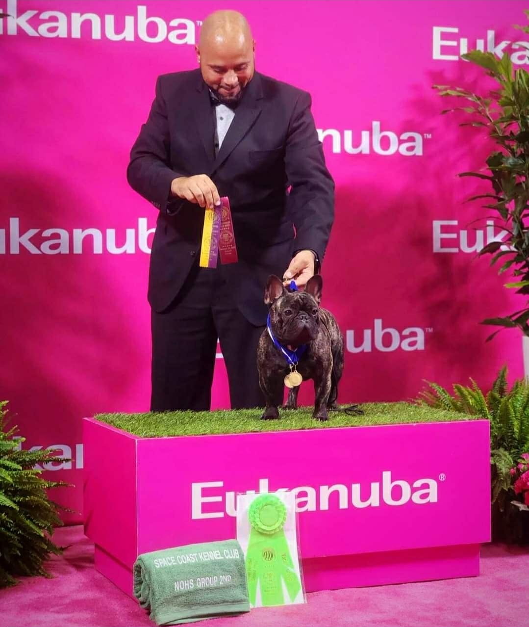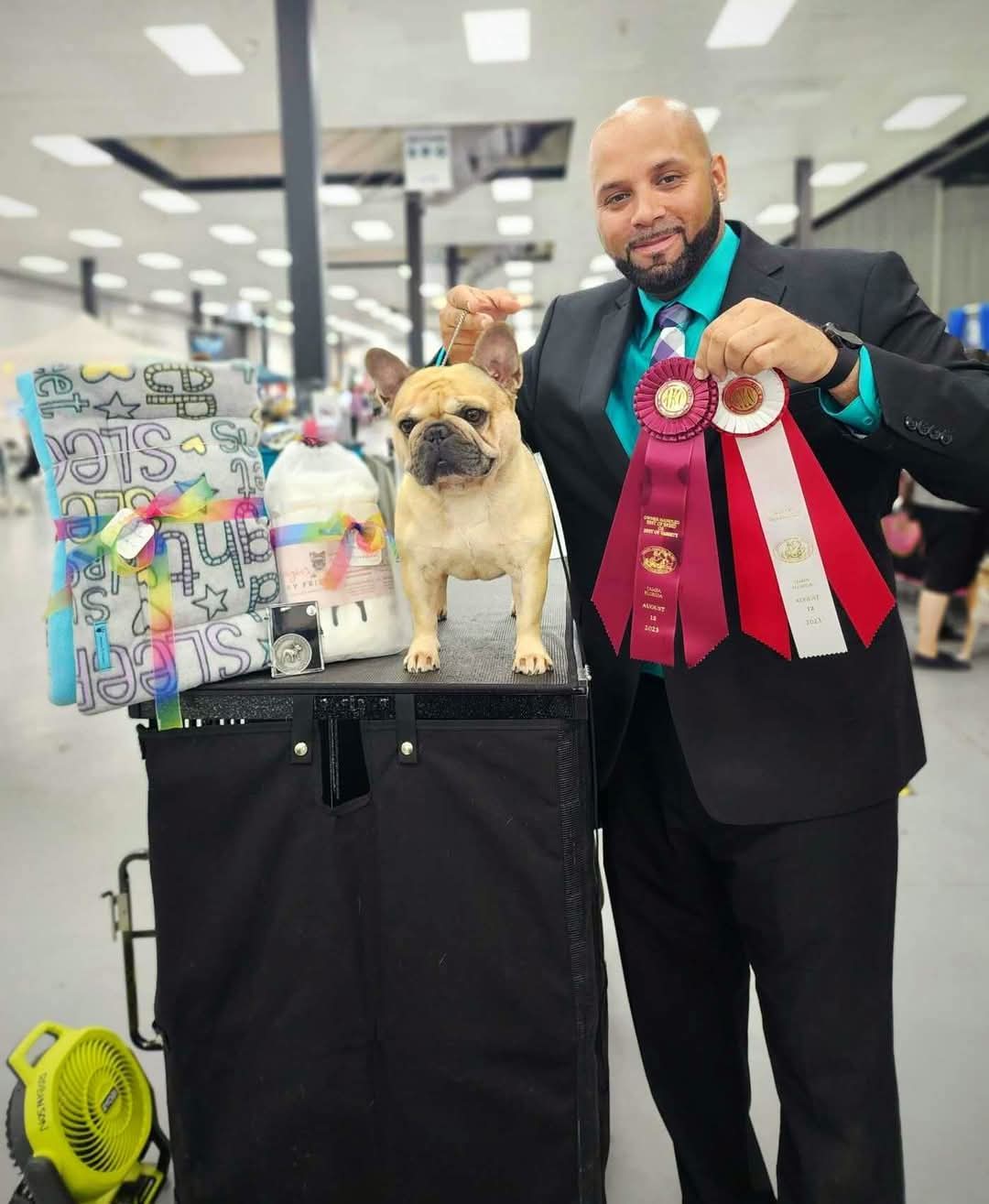 Meet our handsome upcoming stud, Lugo, produced by Sara Pelis and now owned by us right here at SnubNub Frenchies. Lugo is 3 years old, fully matured and has by far exceeded our expectations as to what he could accomplish in the show ring. He finished his AKC Championship title at just 7 1/2 months old. At 10 months old, he became an AKC Grand Champion winning back-to-back shows and followed right along in his father’s footsteps, AKC Grand Champion Gold Signe Du Ciel Dwayne Johnson aka Santino. In 2021 before retiring, his Dad was the #1 French Bulldog in Missouri and #6 in the country. He won select dog at the 2021 Westminster Dog Show, select dog at the 2020 National Royal Canin Show as well as multiple best of breed wins throughout his career. On top of a successful confirmation career, Lugo has earned multiple titles in AKC performance events as well, including titles in Farm Dog, FAST Cat and Lure Coursing. If you are interested in using this handsome stud muffin in the future, please CONTACT US so we can further discuss his services.
