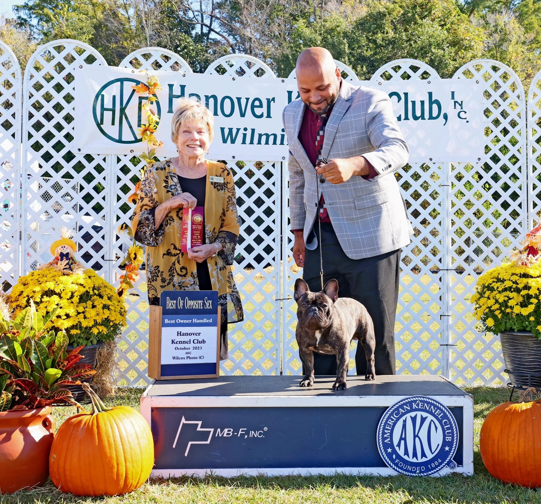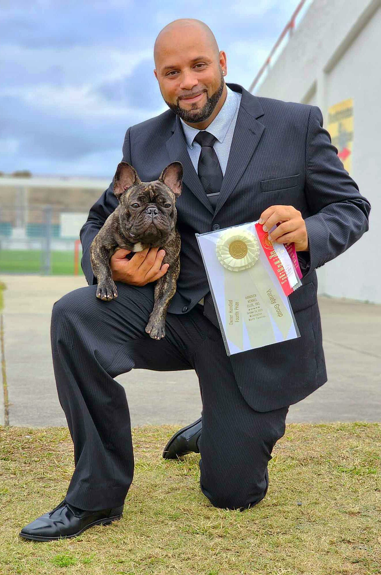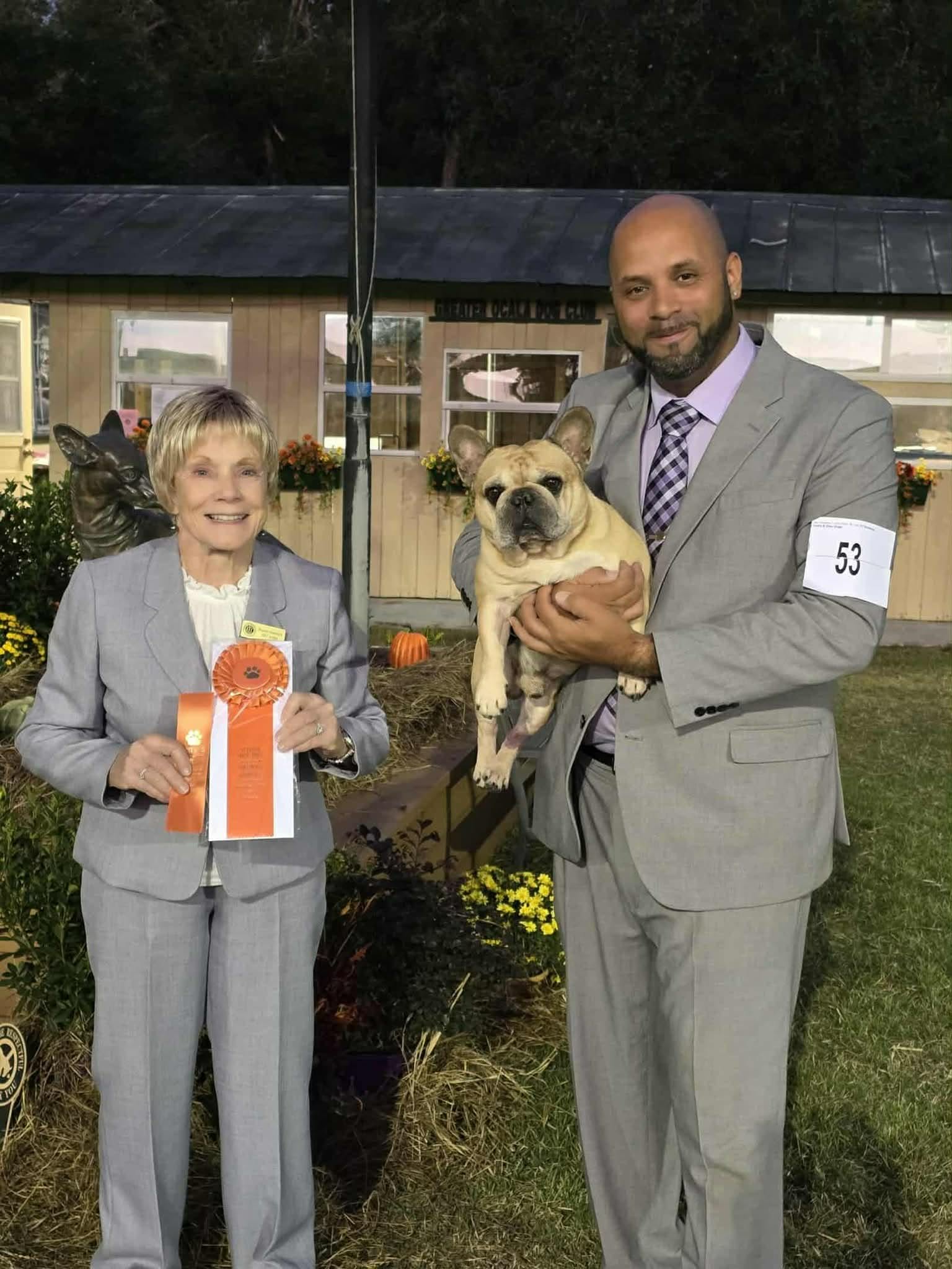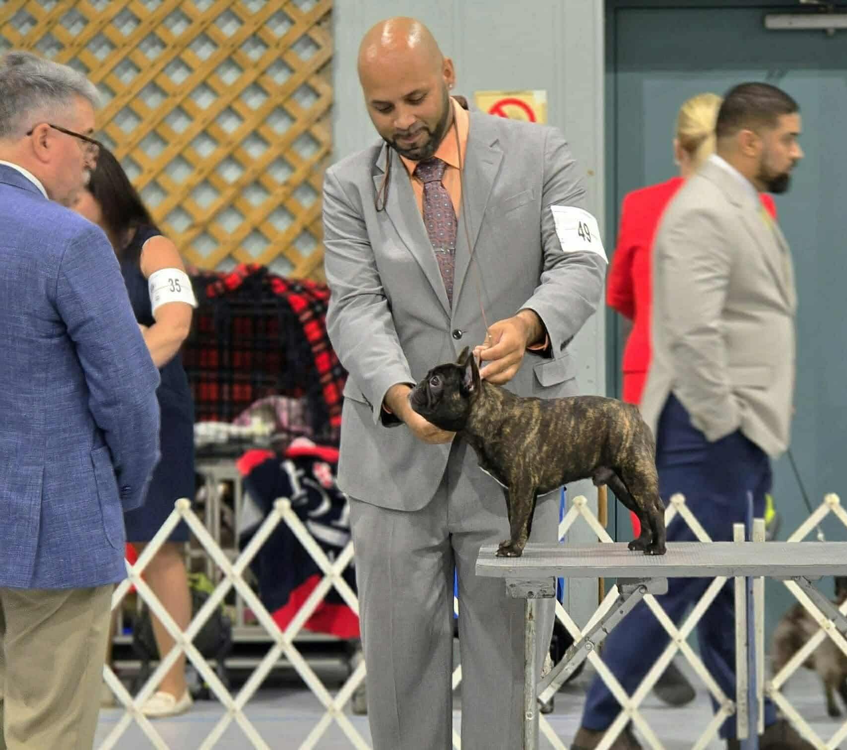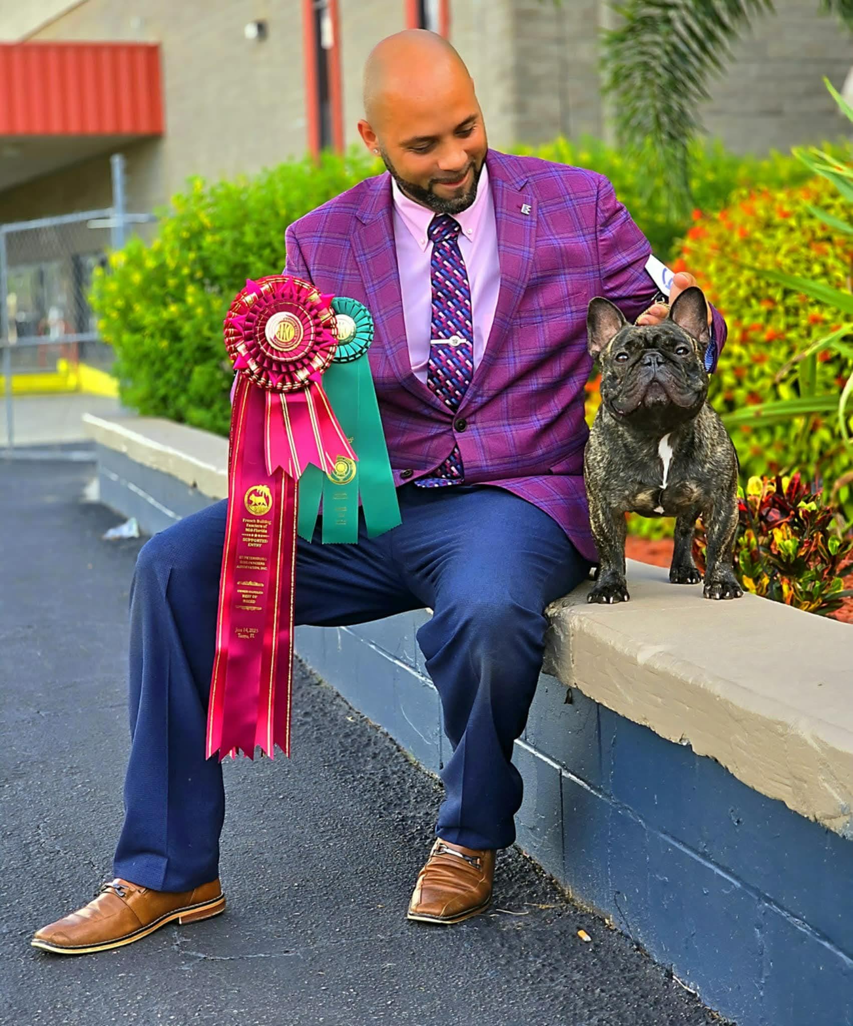 Meet our handsome upcoming stud, Lugo, produced by Sara Pelis and now owned by us right here at SnubNub Frenchies. Lugo is 3 years old, fully matured and has by far exceeded our expectations as to what he could accomplish in the show ring. He finished his AKC Championship title at just 7 1/2 months old. At 10 months old, he became an AKC Grand Champion winning back-to-back shows and followed right along in his father’s footsteps, AKC Grand Champion Gold Signe Du Ciel Dwayne Johnson aka Santino. In 2021 before retiring, his Dad was the #1 French Bulldog in Missouri and #6 in the country. He won select dog at the 2021 Westminster Dog Show, select dog at the 2020 National Royal Canin Show as well as multiple best of breed wins throughout his career. On top of a successful confirmation career, Lugo has earned multiple titles in AKC performance events as well, including titles in Farm Dog, FAST Cat and Lure Coursing. If you are interested in using this handsome stud muffin in the future, please CONTACT US so we can further discuss his services.