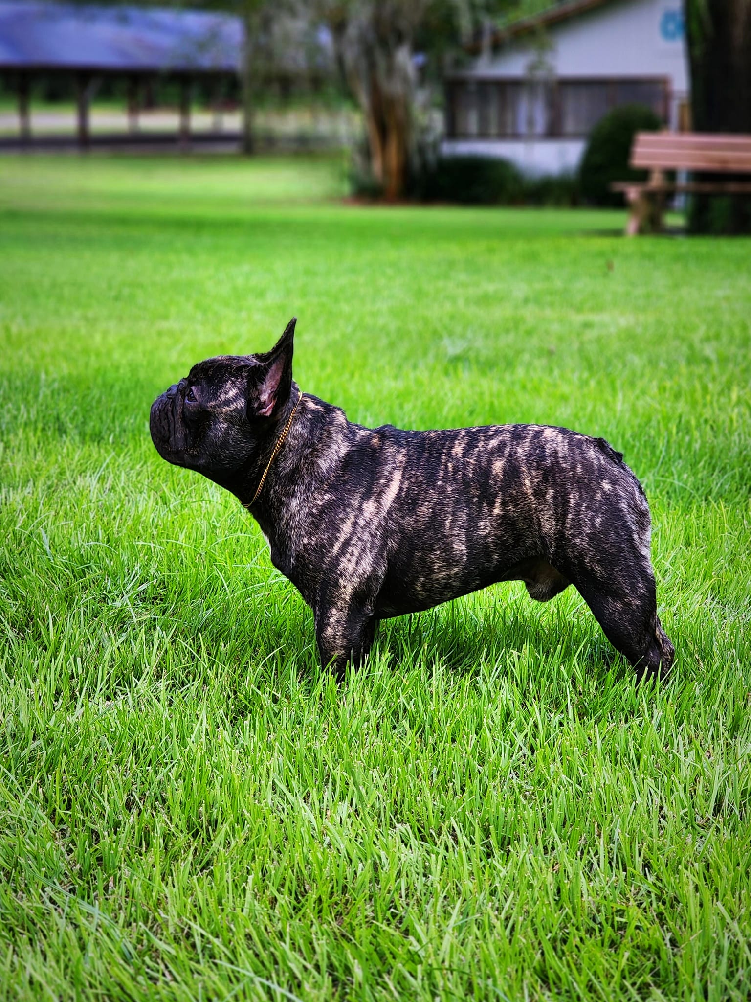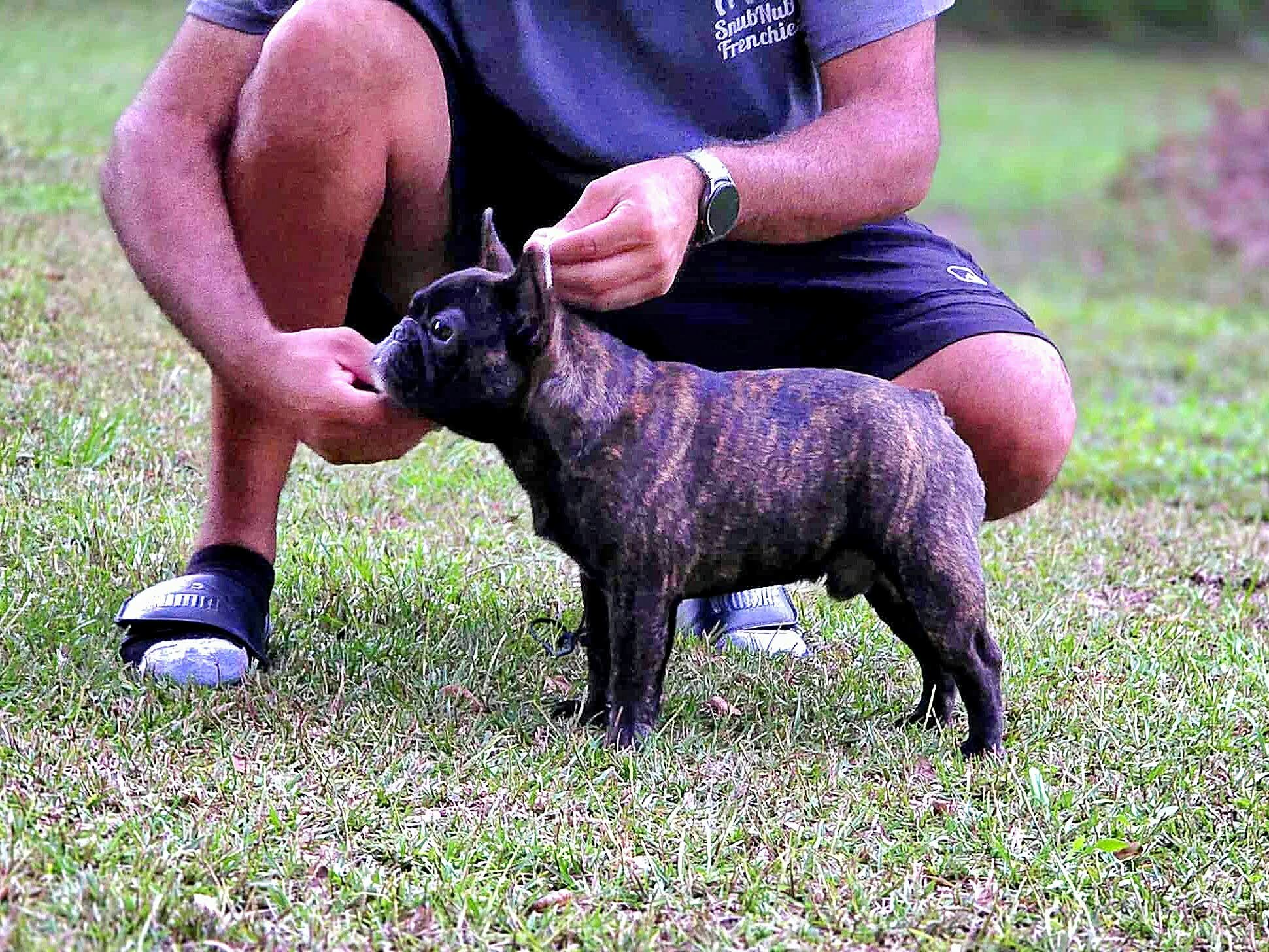 Meet this handsome fella, Crush, a 4th generation produced and owned by us here at SnubNub Frenchies. This amazing little brindle guy has a great temperament and the best personality. We are currently showing him in AKC with hopes to one day soon have the honor of calling him a champion. He is a year old and still has some maturing to do, but we have no doubts he’ll fill out to be a wonderful representation of the breed. If you are interested in using this handsome stud muffin in the future, please CONTACT US so we can further discuss his services.